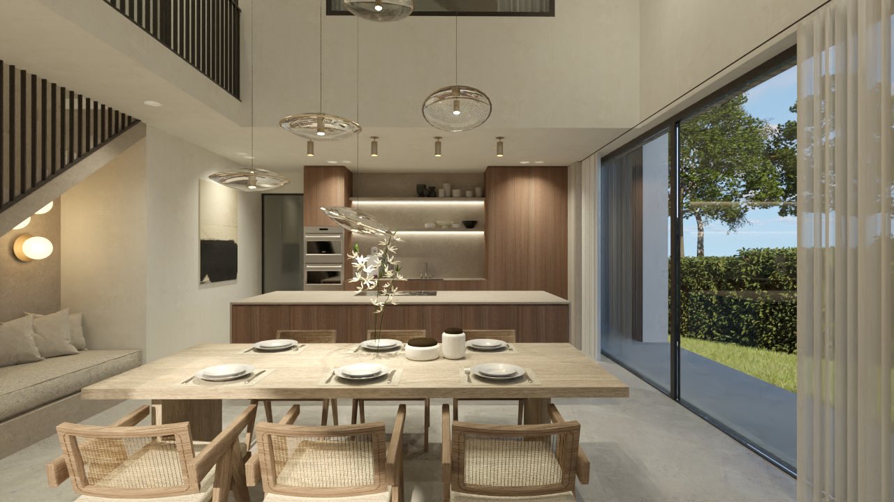 The architecture is structured around a single, elongated gable volume, allowing clean proportions and continuous spatial flows both inside and out. Mineral floors, warm timber cladding and large glazed openings define a coherent material language that enhances natural light and visual depth. Double-height interiors and carefully orchestrated outdoor niches create a sense of generosity, making the new construction feel both sculptural and intimately livable.