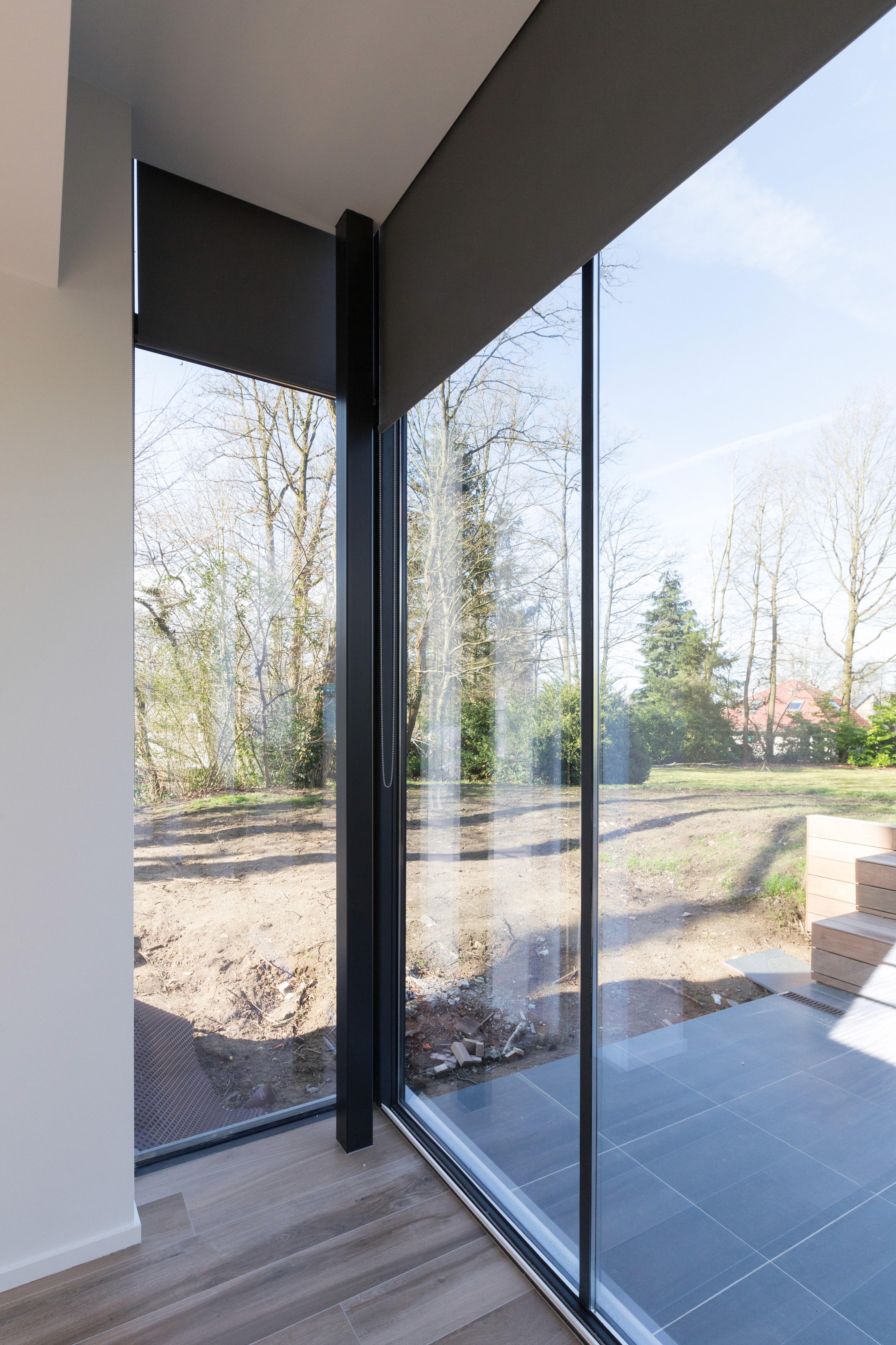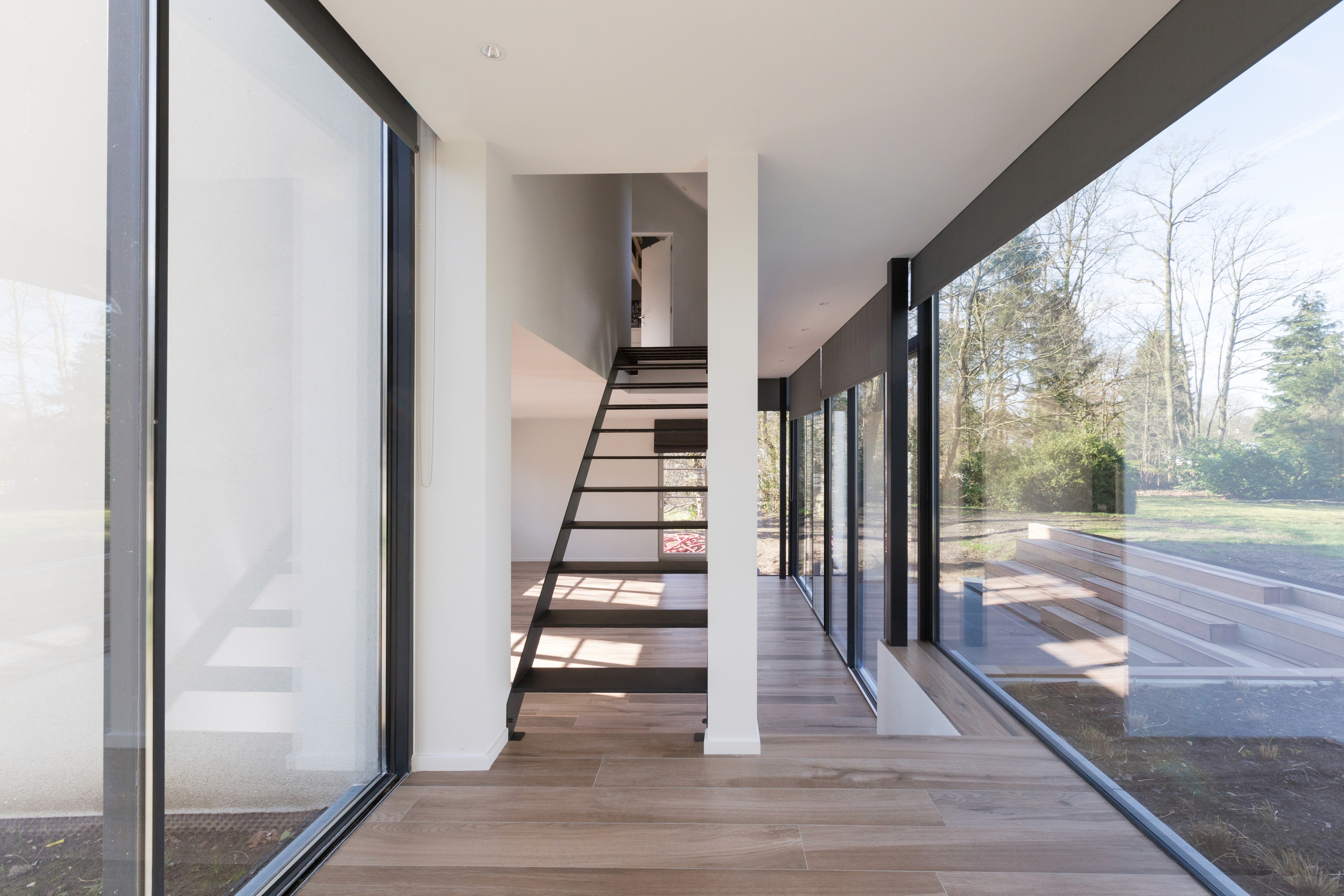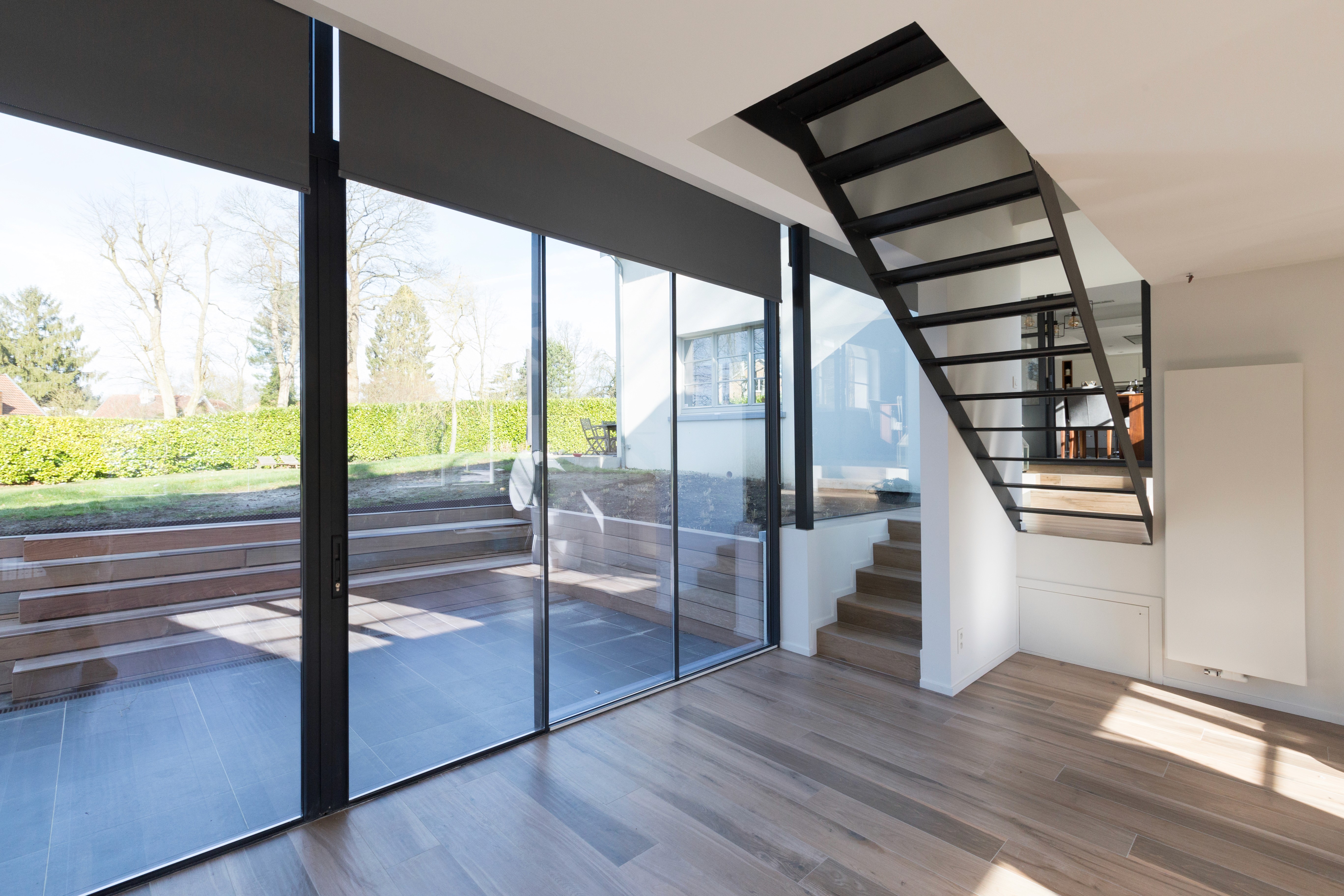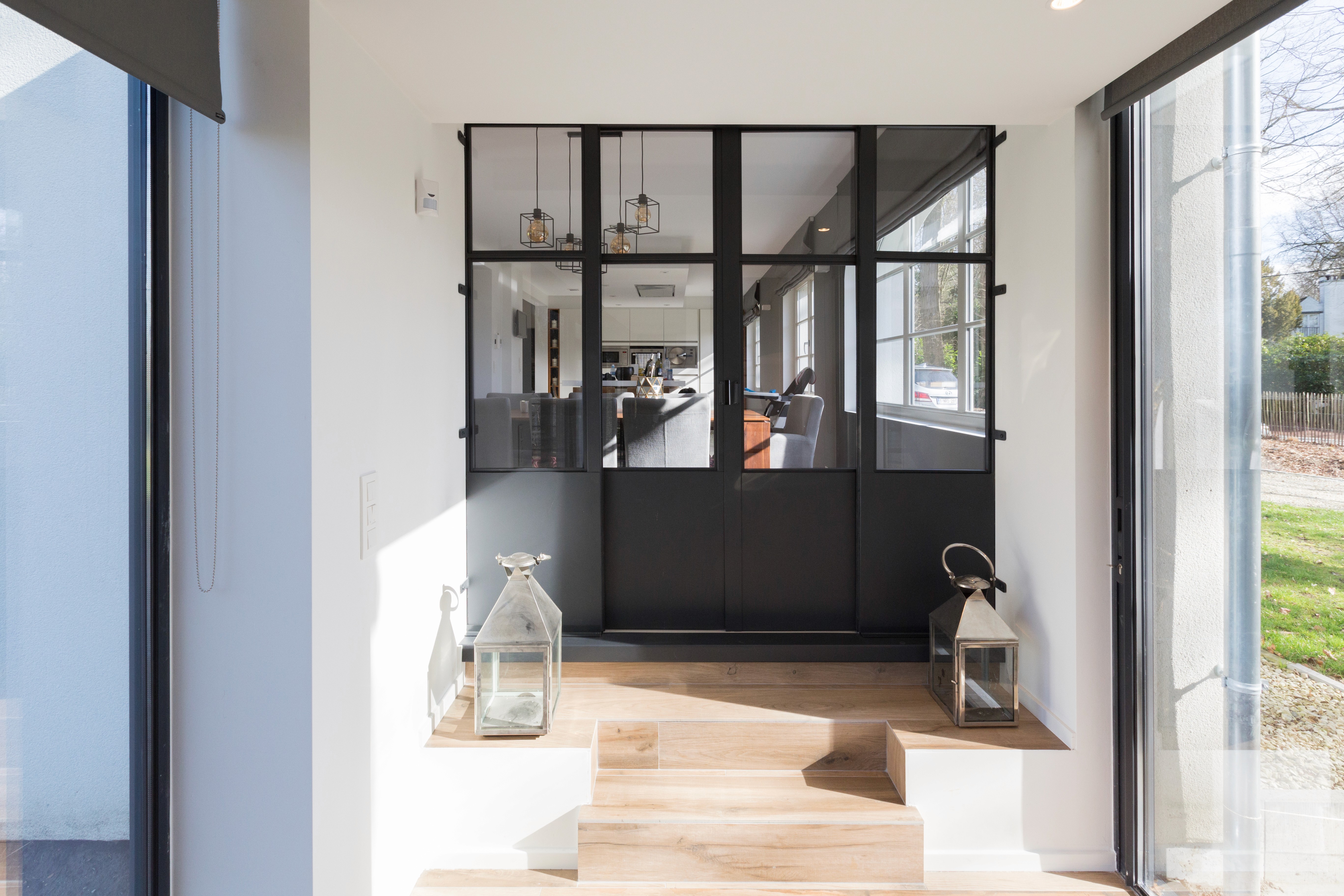 The glass bridge creates a suspended transition between levels, allowing natural light to circulate freely through the heart of the house. Its minimal metal framing contrasts with the traditional volumes, introducing a precise contemporary language without overwhelming the existing architecture. By framing views toward the garden and opening new visual axes, the bridge becomes a key spatial element that unifies the renovation.