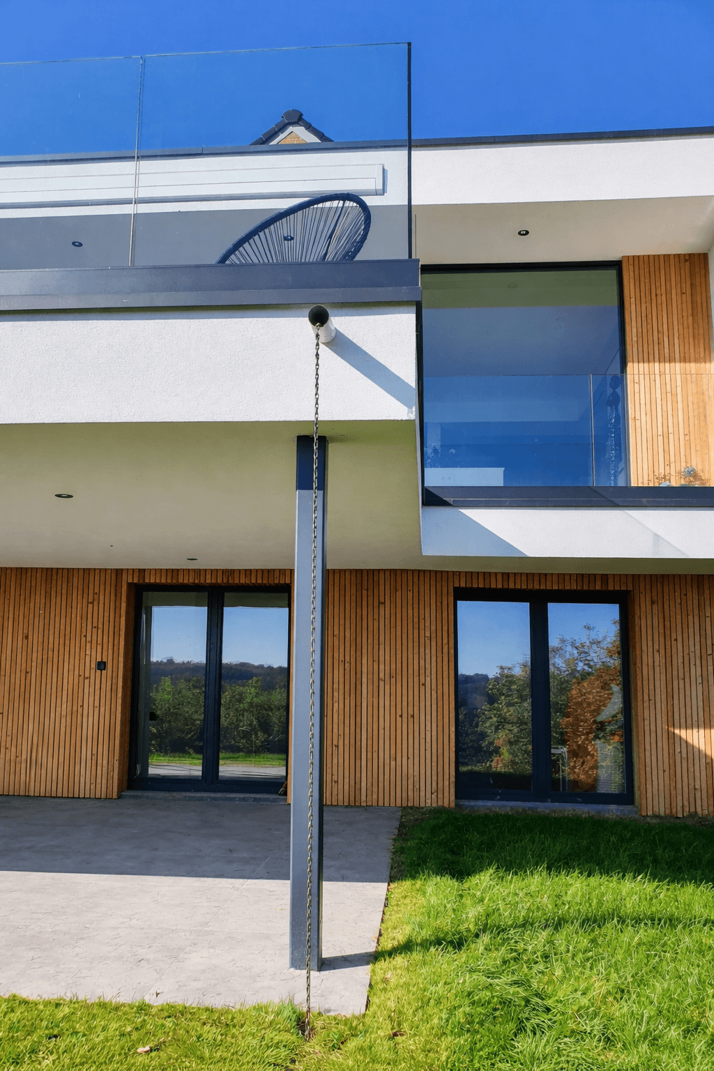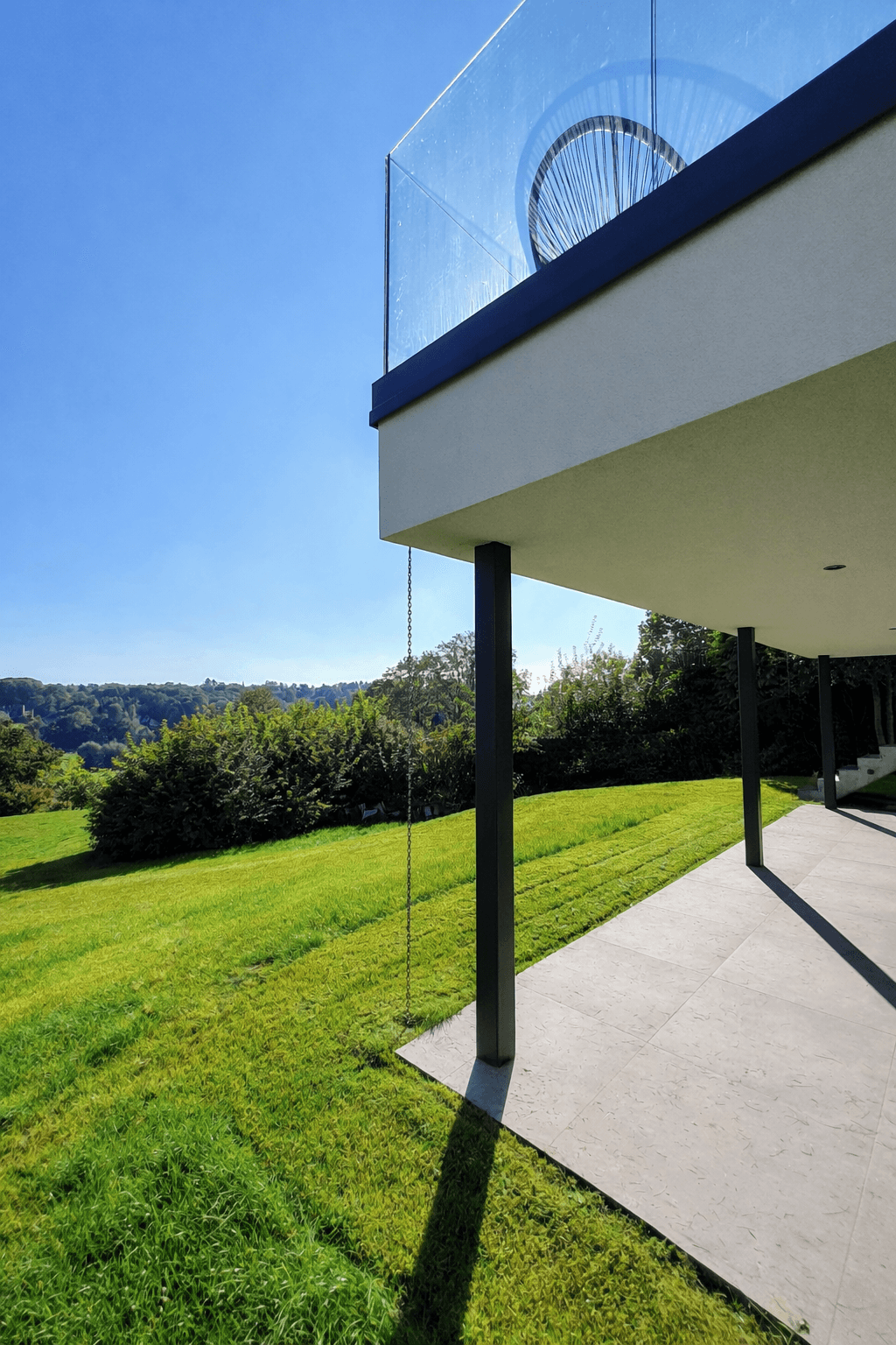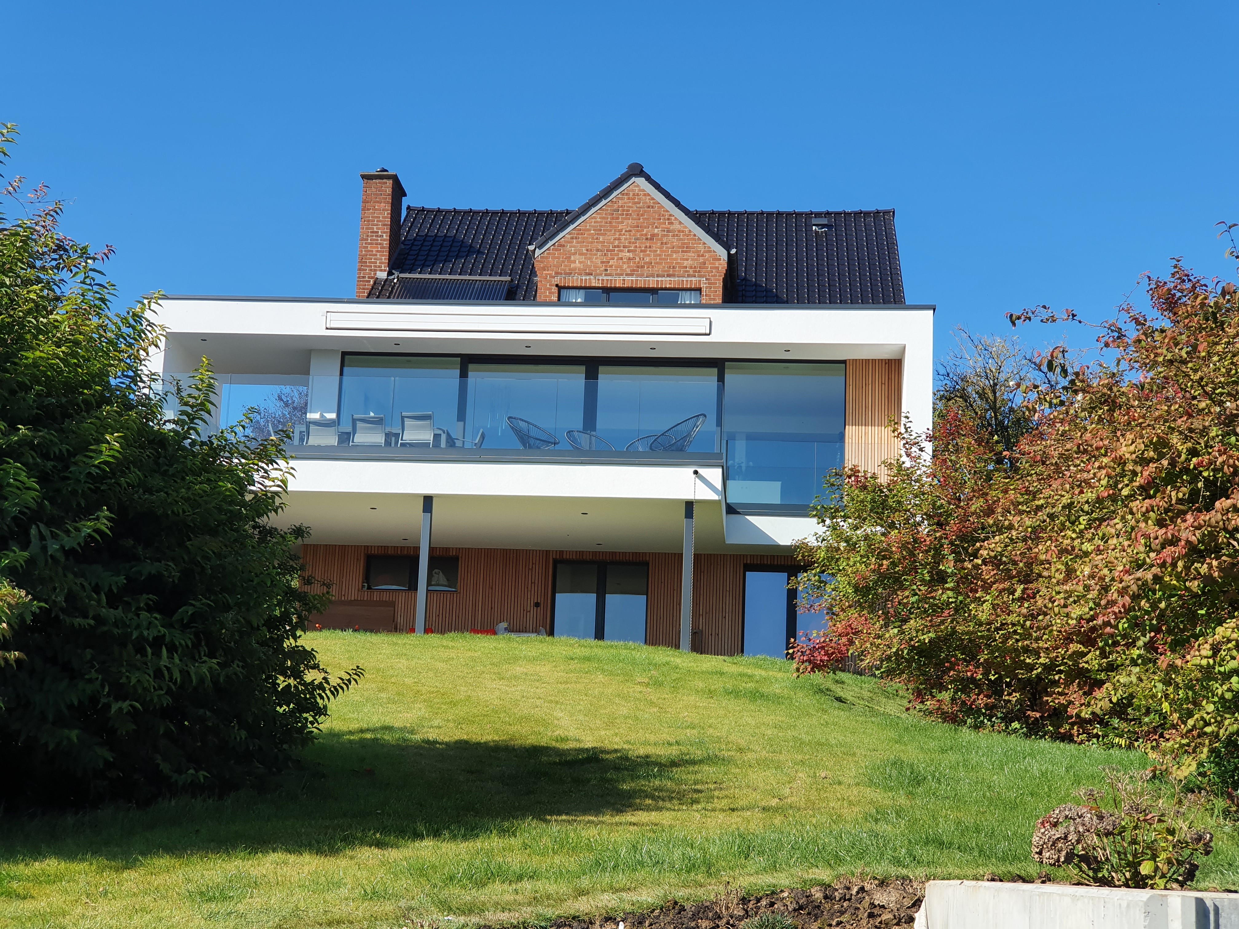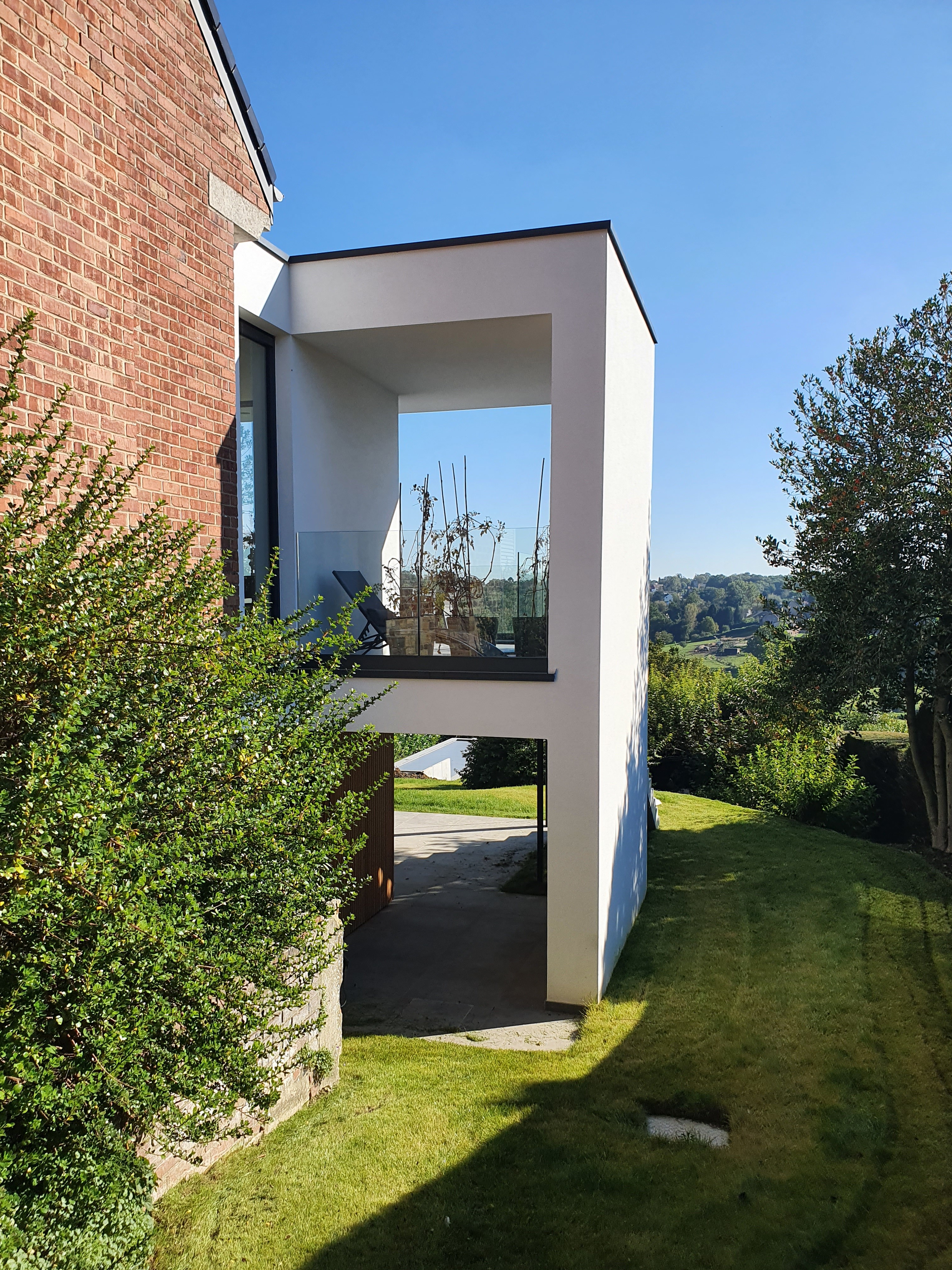 Set on a sloping site, this renovation introduces a minimalist architectural volume that opens widely onto the surrounding landscape. The integrated pool extends the outdoor living experience while maintaining clean lines and strong spatial coherence. Large glazed surfaces, refined materials and precise structural detailing create a balanced dialogue between the existing house and its contemporary transformation.