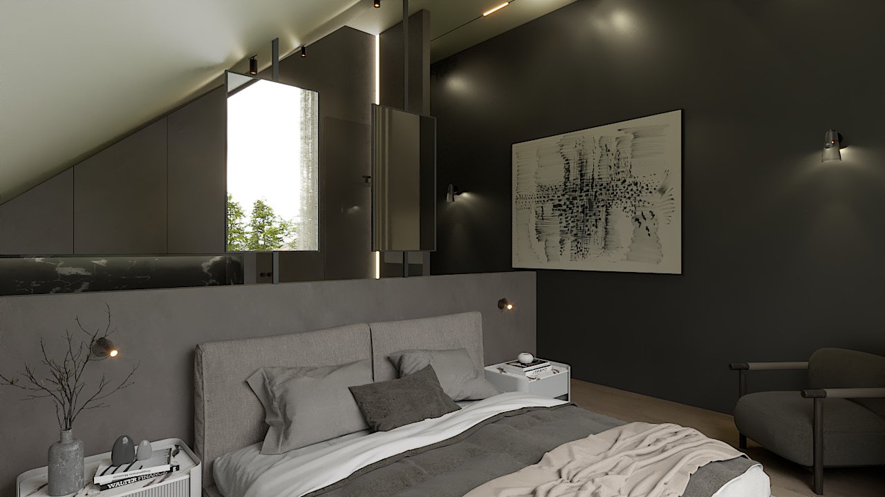 The fragmented mirror composition creates layered perspectives, subtly extending the spatial depth. Dark, matte surfaces modulate the ambient light, producing a controlled and intimate atmosphere. The material palette emphasises structural clarity, balancing shadow, reflection and refined geometry.