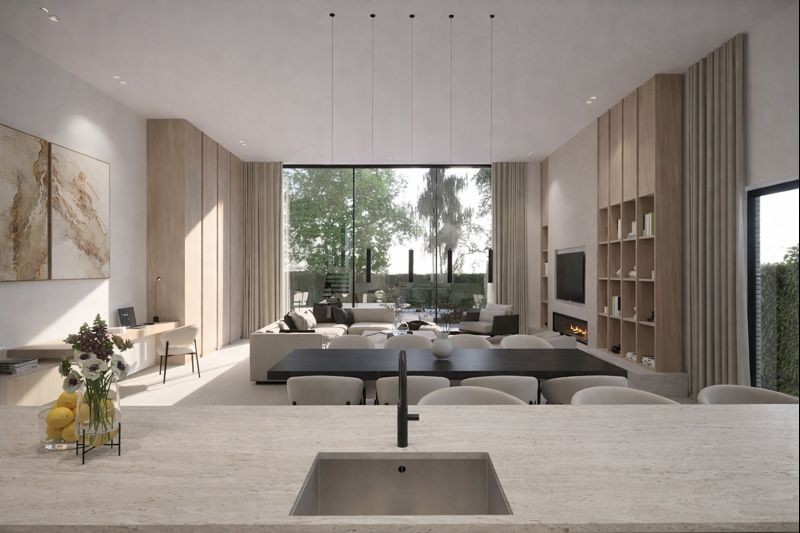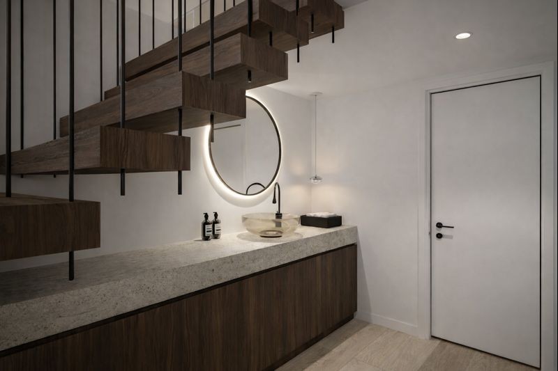 This third facade reveals a calm, carefully composed space. The staircase becomes a central architectural gesture, structuring circulation while drawing natural light deep into the interior. A quiet yet expressive volume, where clarity, proportion, and materiality define the character of the home.