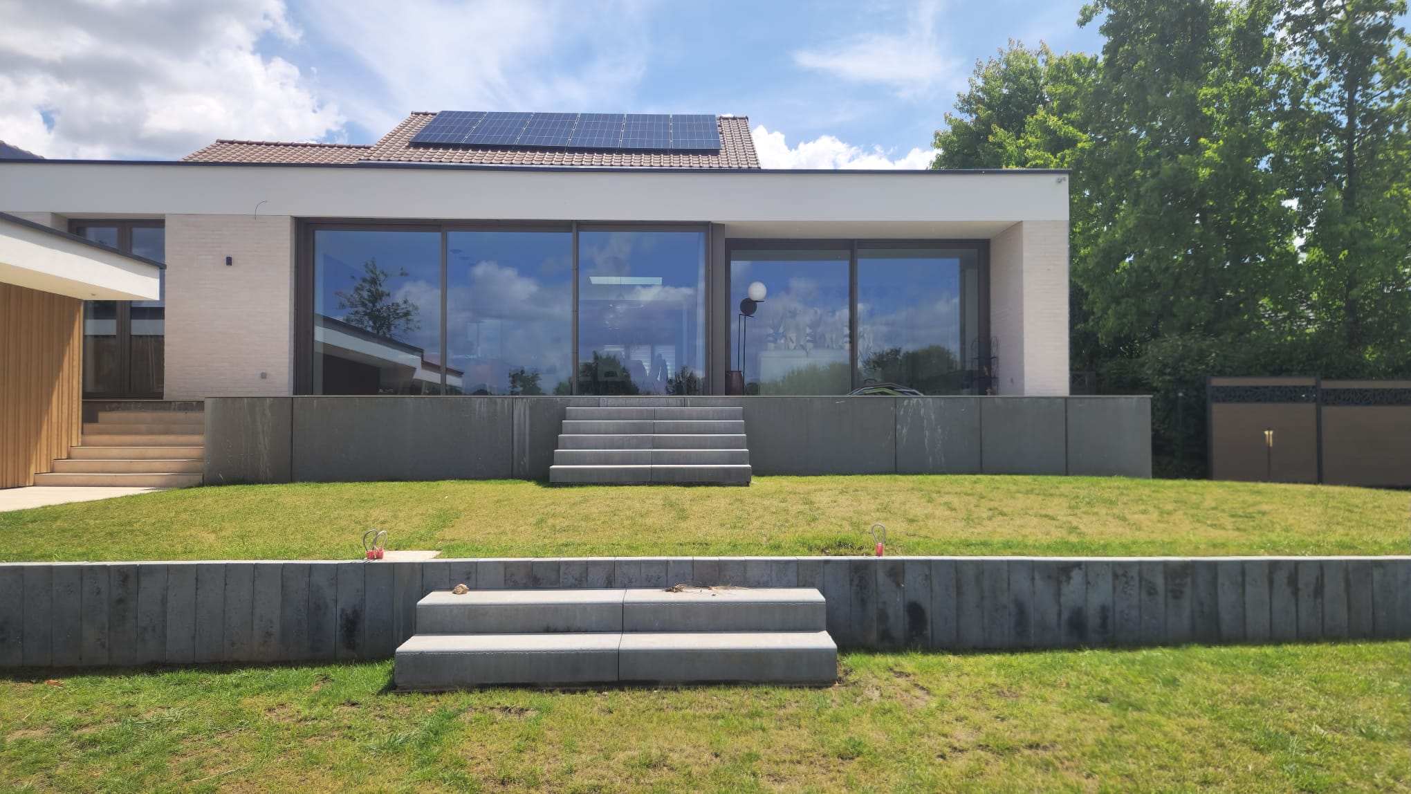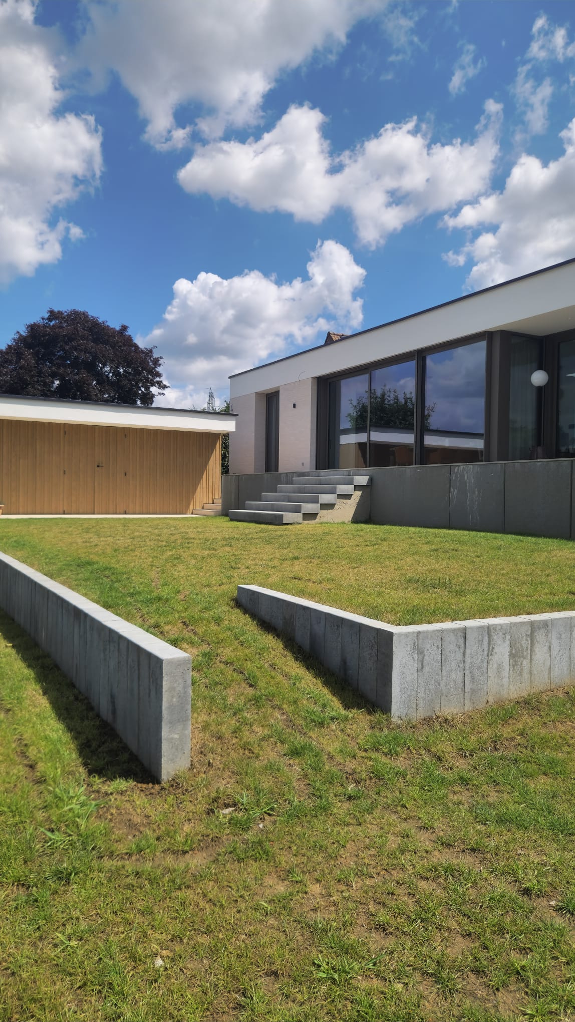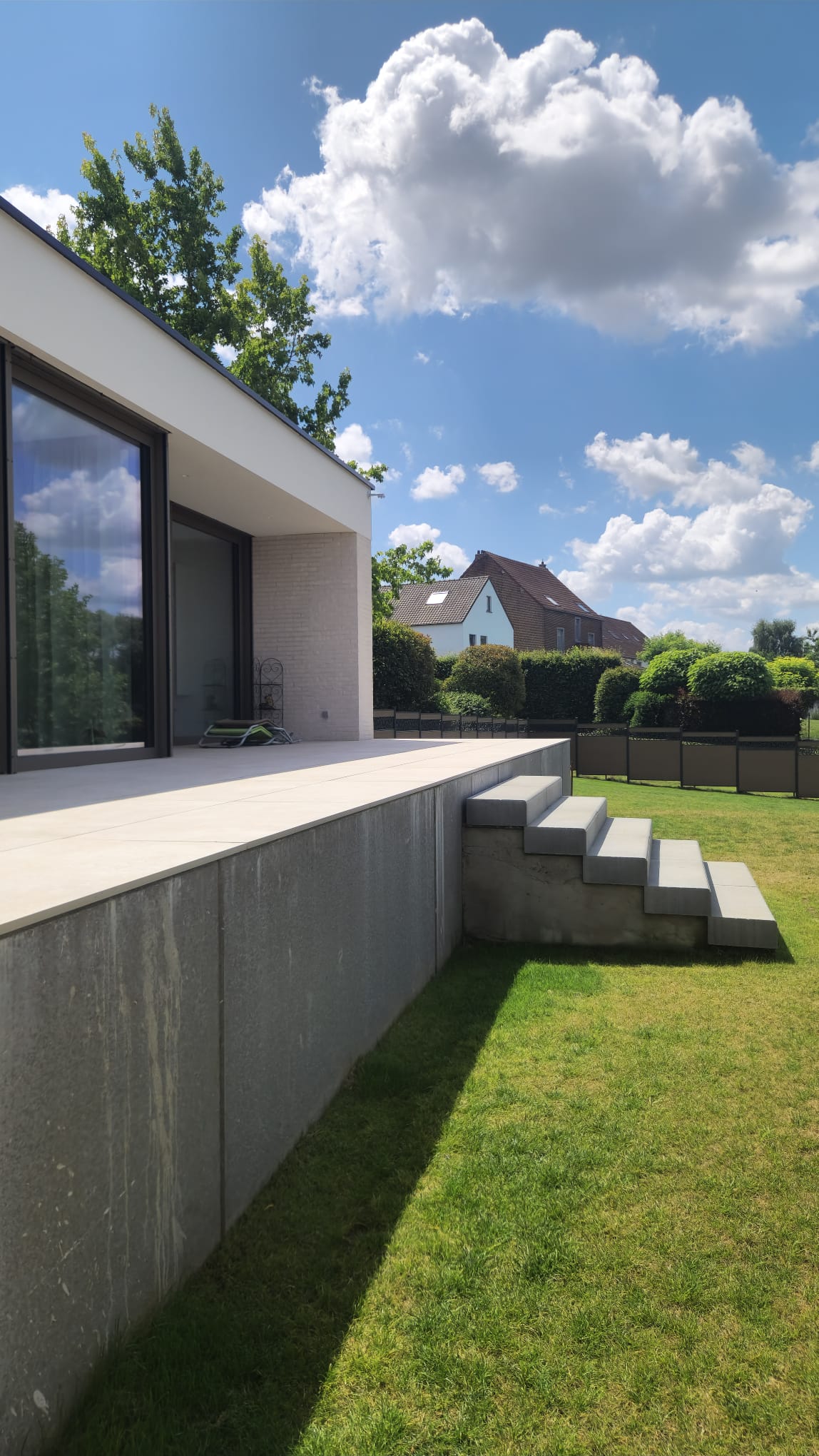 The project redefines the landscape through a sequence of concrete terraces that stabilise the terrain while guiding circulation. Minimalist steps and retaining walls are designed with strict geometric clarity, ensuring both structural performance and visual coherence. Warm cladding, expansive glazing, and calibrated transitions create a balanced dialogue between the architecture and its topography