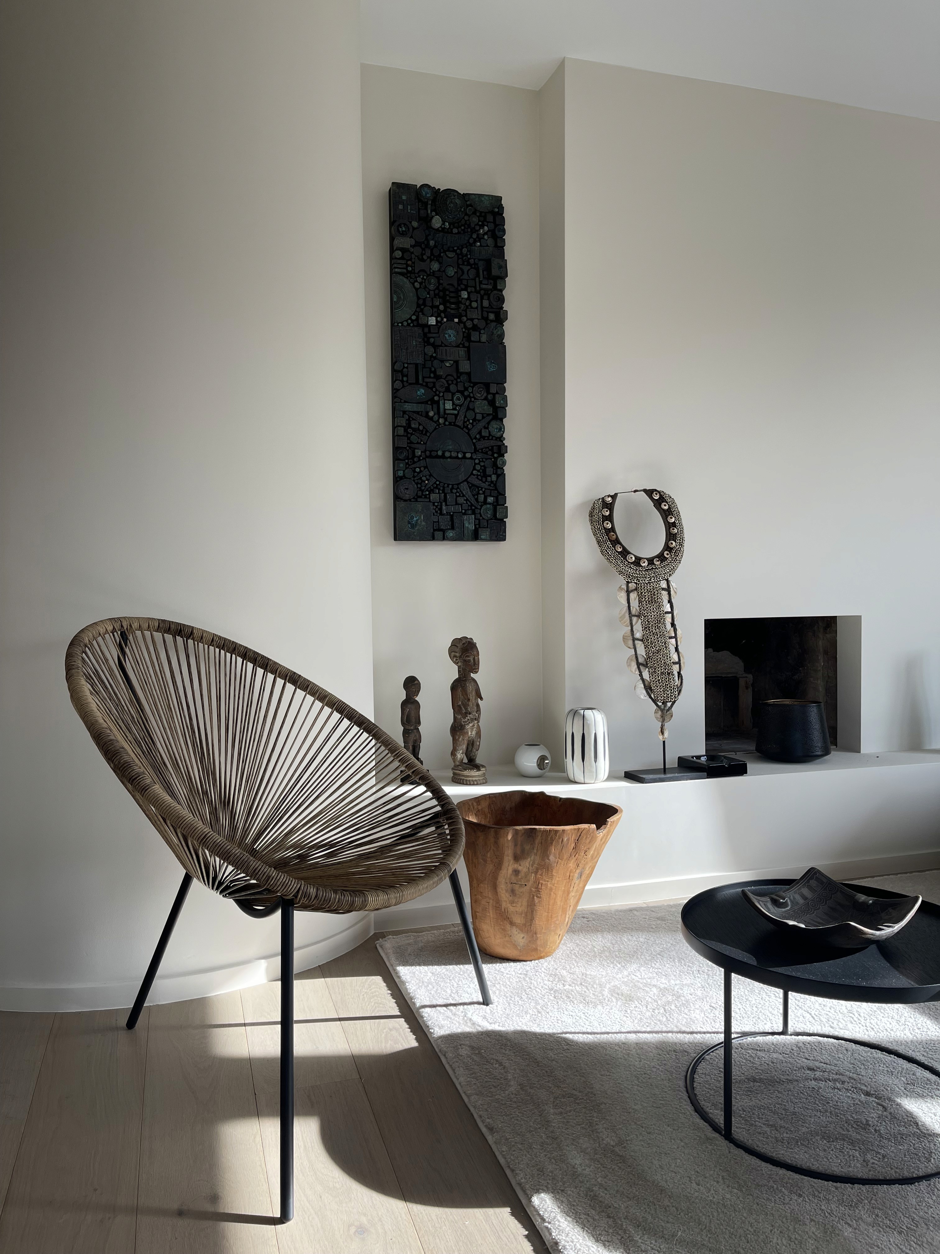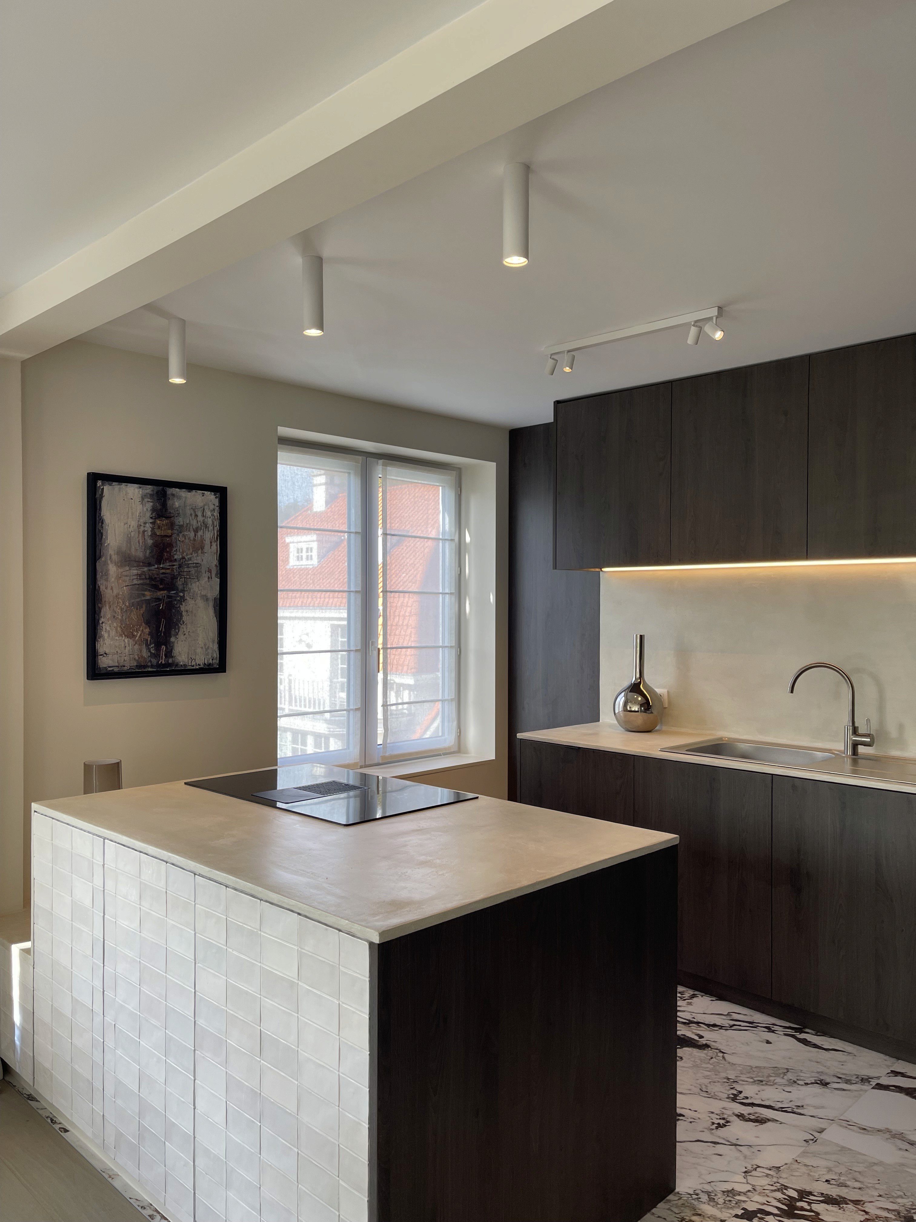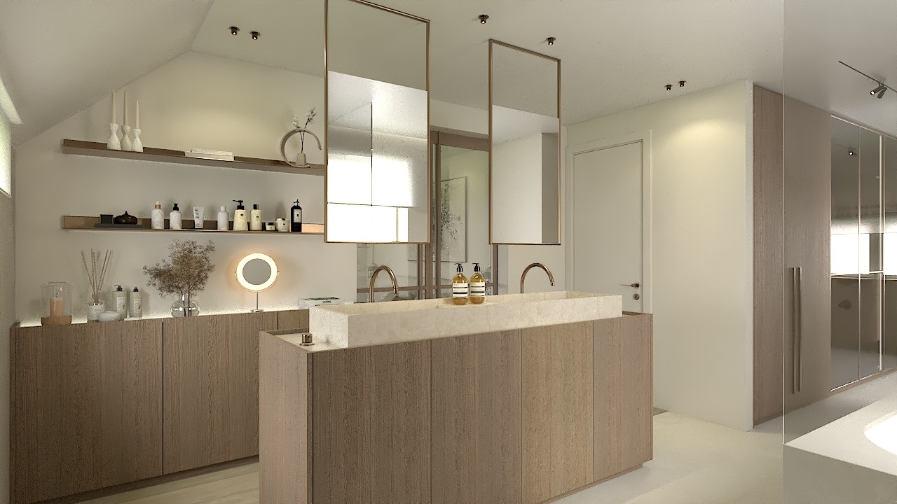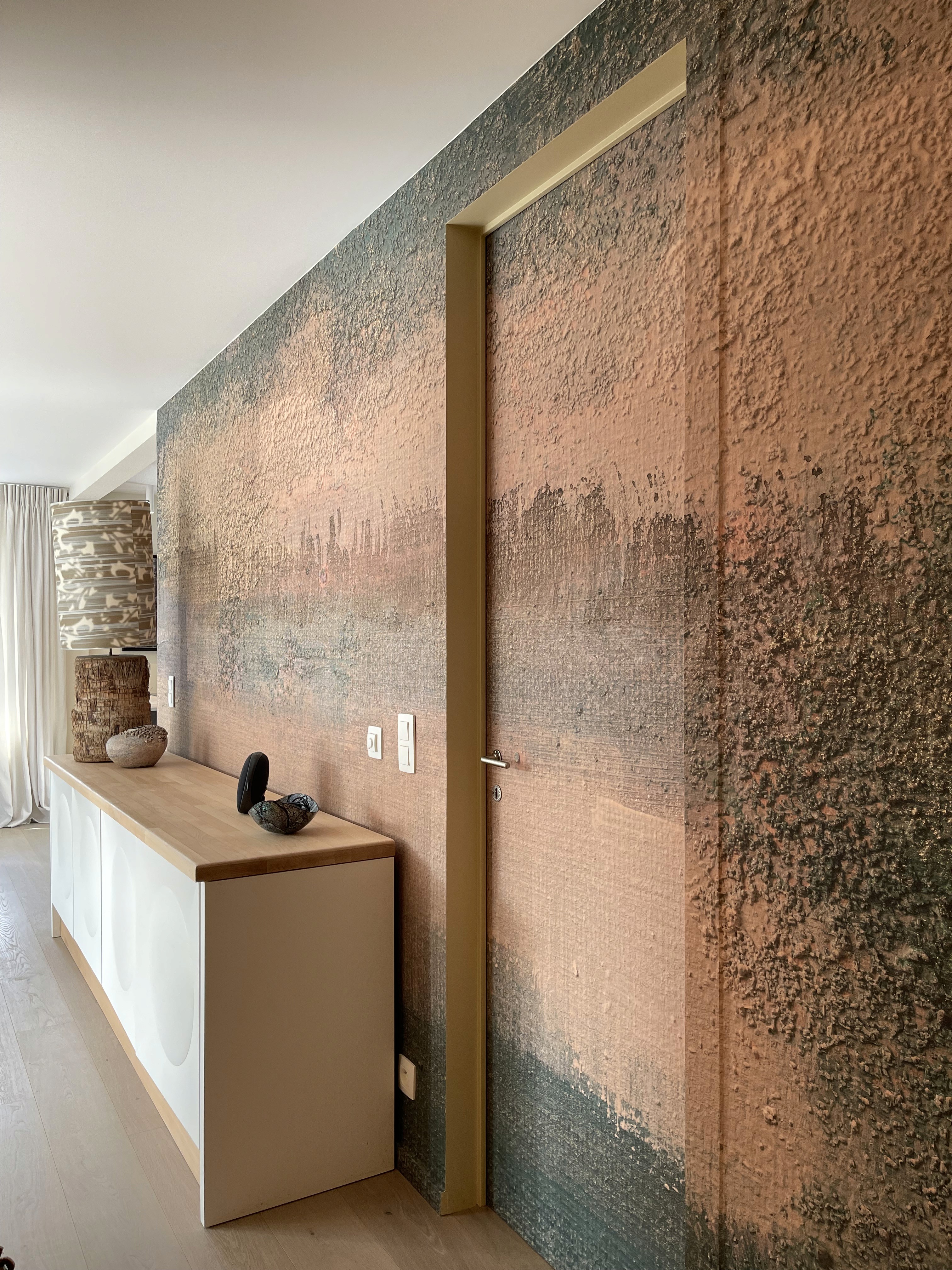 The project structures its spaces through a meticulous interplay of textures, from mineral finishes to the bespoke wall covering created with Pascale Christoffel. Each volume is articulated with clarity: refined cabinetry, calibrated lighting lines, and cohesive material junctions emphasise precision. The overall composition balances craftsmanship and contemporary restraint, offering a warm, tactile environment anchored in architectural coherence.